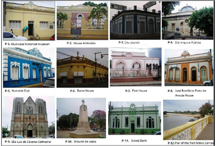 The interpretive route of the Architectural, Urban, and Landscape Ensemble of Cáceres/MT, called Historic Center, comprises twelve points of interest, or stops for observation of landscape elements. These are three public property buildings, two still in full use today; a historic monument; a public square; the pier Mário Corrêa, overlooking the natural landscape of the Mato Grosso Pantanal; a church; and some old mansions exhibiting traces of European architectural styles (Figure 2).