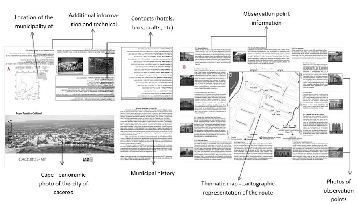 In addition to the photographs and written information about the points of interest, the guide of the interpretative route (Figure 3) has a thematic map 1:5,000 scale, made from high resolution satellite images, field, and mapping data, which shows the observation points. The objective of the insertion of the cartographic representation was to show the location of the cultural goods along the itinerary.